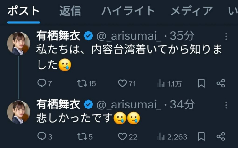 被没有参展的女优这么说,已经退役的女优かさいあみ(河西亚美)是回覆说那些亲密互动都是事先讲好的,绝对没有强迫情事,但接下来马上就有女优转推乙アリス(乙爱丽丝)的发文: